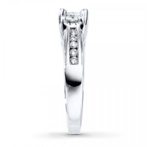 Representing your past, present and future together, this three-stone ring dazzles with a trio of princess-cut diamonds framed in round diamonds as its centerpiece. More round diamonds are channel-set along the band of 14K white gold to complement. The ring has a total diamond weight of 1 carat.